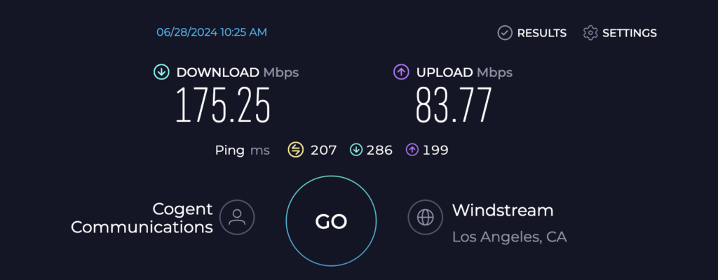 但是才测速点时候,选择不同的服务器测出来会出现不同的结果,这里的WindStream服务器测的最正常。我的服务器是上下行300Mbps的带宽,实测在200附近波动(+-30),上行带宽有些服务器会只有20多Mbps,后续也许可以再优化一下